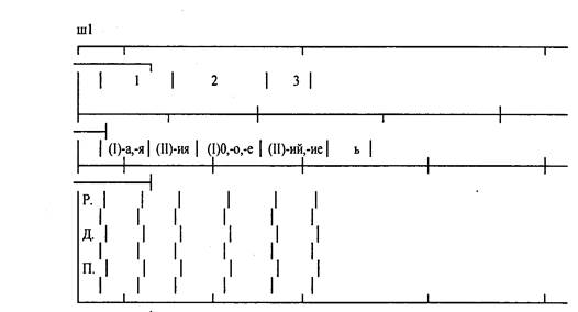 Покажем на конкретном примере один из вариантов методики построения и ввода алгоритма - формулы применительно к теме "Буквы Е и И в падежных окончаниях существительных". Вначале учащимся предлагается "чистая" таблица, которая заполняется под руководством учителя в процессе эвристической беседы и в итоге приобретает следующий вид: