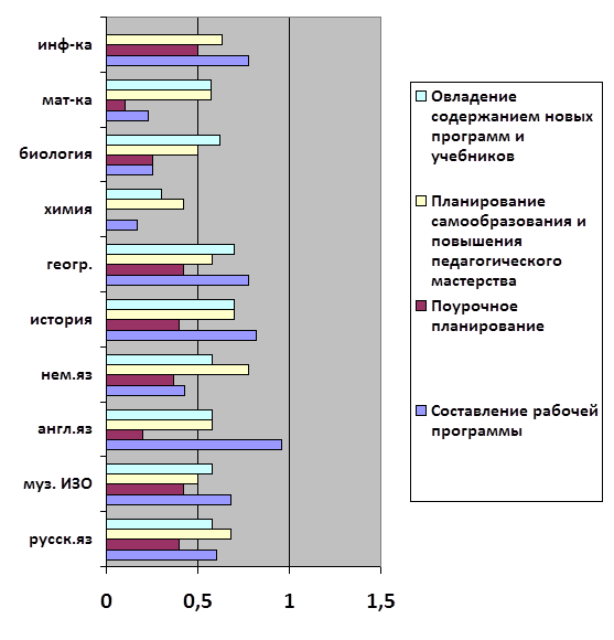 По самооценке, 54% педагогов имеют затруднения в вопросах планирования педагогической деятельности (рис.1). анкетирование показало, что меньше всего затрудняются в планировании своей работы учителя химии, так, например, у них не возникает трудностей в написании поурочных планов. Максимальные затруднения по этому показателю имеют учителя истории и информатики, а именно в вопросах, связанных с составлением рабочей программы, с овладением содержания новых программ и с планирование самообразования (рис.2). Большое количество учителей английского языка не достаточно владеют навыком составления рабочей программы (рис.1).