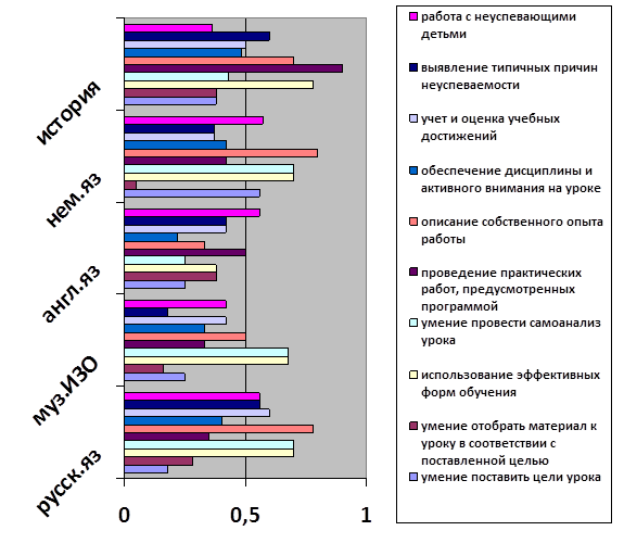 Также присутствуют трудности в описании собственного опыта работы и в умении провести самоанализ урока. Почти 90% учителей истории испытывают трудности в проведении практических работ, предусмотренных программой. Более 50% педагогов по истории испытывают информационные потребности в следующих аспектах педагогической деятельности: