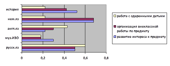 Около 70% учителей английского языка затрудняются в организации внеклассной работы по предмету и в формировании у обучающихся интереса к иностранному языку. По работе с одаренными детьми испытывают затруднения в большинстве своем педагоги гуманитарного цикла (учителя русского языка и литературы).