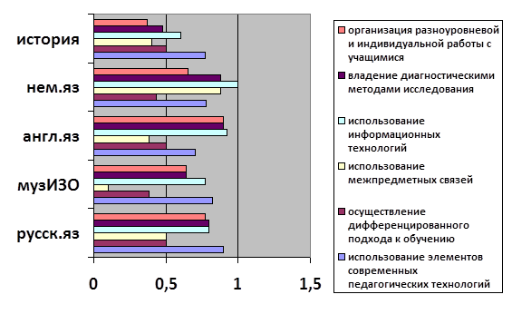 Нами было отмечено, что учитель осознает систему своей работы, свои достижения, а также затруднения и недостатки, он активно использует на уроке методики выбора оптимальных методов, форм и средств обучения, ответственно подходит к отбору учебного материала, выносимого на урок.