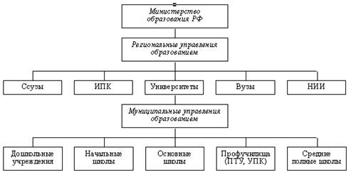 Третьим элементом образовательной системы России являются органы управления образованием. Согласно Конституции Российской Федерации общие вопросы образования находятся в совместном ведении Российской Федерации и ее субъектов. Это означает, что по предметам совместного ведения Российская Федерация и субъекты Российской Федерации издают, кроме федеральных законов, законы и иные правовые акты субъектов Российской Федерации, принимаемые в соответствии с ними[2]. На уровне Российской Федерации действуют: