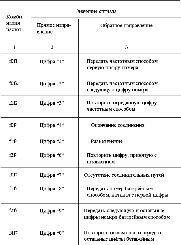 Для передачи линейных сигналов и сигналов управления между АТСЭ и для связи АТСЭ системы DX-200 между собой используется децентрализованная система сигнализации R1. В частности для передачи адресной информации применяется многочастотный код “2 из 6”. Состав многочастотных сигналов данного кода приведен в таблице 1.1.
