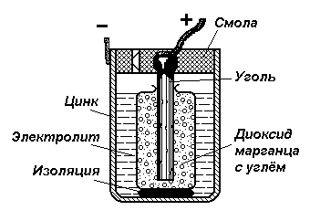 палочки или пластинки, которая находится в мешке, наполненном смесью диоксида марганца с порошком угля или графита. Уголь или графит добавляют для уменьшения сопротивления. Угольный стержень и мешок с деполяризующей массой называют агломератом. В качестве электролита используется паста, составленная из нашатыря (NH4Cl), крахмала и некоторых других веществ. У стаканчиковых элементов центральный вывод является положительным полюсом.