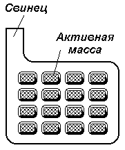 Пластины современных аккумуляторов изготовляются решетчатыми (рис.8) и заполняются активной массой, состоящей из диоксида свинца для положительных пластик и губчатого (мелко раздробленного) свинца для отрицательных.