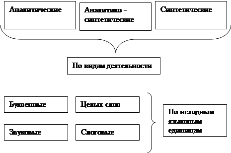 В зависимости от того, какая единица языка берется как исходная при обучении элементарному чтению (буква, звук, слог, целое, слово), и от того, какой вид деятельности учащихся (анализ, синтез) является ведущим, методы обучения грамоте могут быть классифицированы в соответствии со следующей таблицей:
