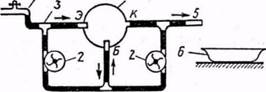 Источником переменного "напряжения" для модели (см. рис.8) служит вход 4, который подключают к водопроводному крану. Меняя с помощью крана скорость течения жидкости в установке, регулируют давление (напор) в ней. В этой установке давление жидкости служит аналогом напряжения в электрической цепи транзистора. Насосы выполняют роль источников постоянного тока, трубки с водой — соединительных проводов, а стеклянная трубка 5 - постоянного резистора R, включенного в цепь, показанную на рис.7.