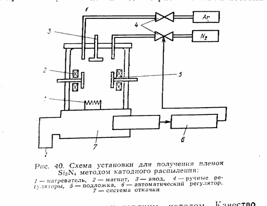 Реактивное катодное распыление. При этом методе реакция между кремнием и азотом происходит при низкой температуре окружающей среды с помощью электрического разряда. Наносят защитные пленки нитрида кремния в установках катодного распыления на постоянном токе с холодным или горячим катодом. Качество пленок, получаемых этим методом, изменяется в зависимости от условий осаждения. Для проведения процесса используют катод из высокочистого кремния в виде плоской пластины большого диаметра. Этот катод распыляют в смеси аргона и азота. Азот является реактивным газом, а аргон используют для повышения эффективности распыления. Кремний взаимодействует с кислородом лучше, чем с азотом, поэтому даже незначительное количество кислорода в рабочих газах (N2 и Ar) приводит к образованию пленки окиси кремния SiO2 на поверхности полупроводника. Обычно для катодного распыления используют рабочие газы, прошедшие предварительную очистку от кислорода. Получение защитных пленок Si3N4 проводят при давлениях в камере от 6,6*10*до 26 Па. Напряжение распыления может быть выбрано от 600 до 2500В, а катодный ток-0,2*0,8мА\см2. Скорость роста пленки 10 нм\мин. Применение катода с большей поверхностью позволяет получать пленки одинаковой толщины(с разбросом, не превышающим 5%) одновременно на большом количестве пластин или кристаллов.