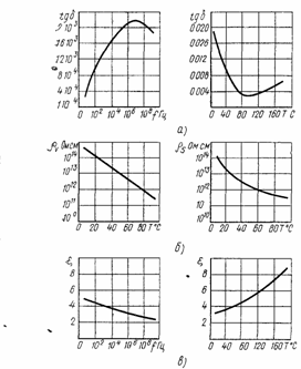 Рис 43 Зависимость свойств эпоксид ных смол от частоты и температуры в — тангенса угла диэлектрических потерь б — объемного и поверхностного удельного сопротивления е — диэлектрической проницае мости |