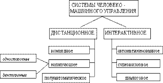 Человеко-машинные системы реализуют дистанционное или интерактивное управление. Если при дистанционном управлении оператор управляет всеми операциями рабочего цикла, то при интерактивном управлении одними операциями управляет человек, а другими- автоматическое устройство.