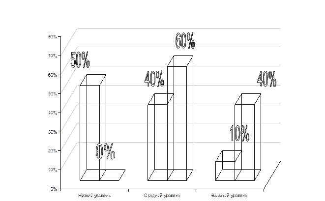 В контрольной группе изменения оказались не такими значительными. С высоким уровнем развития было 10%, так и осталось 10%. Со средним было 50%, стало 60%. С низким уровнем было 40%, стало 30%.