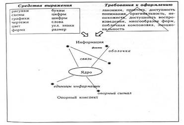 Опорный сигнал - ассоциативный символ (знак, слово, схема, рисунок и т.п.), заменяющий некое смысловое значение. Опорный конспект - система опорных сигналов в виде краткого условного конспекта, представляющего собой наглядную конструкцию, замещающую систему фактов, понятий, идей как взаимосвязанных элементов целой части учебного материала.
