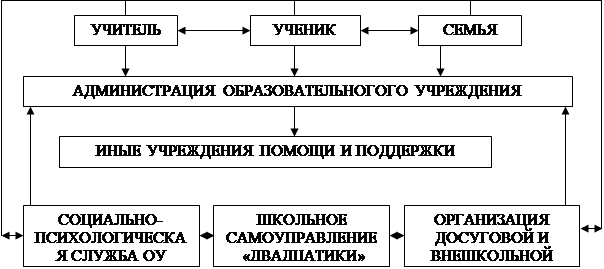 Схематично модель воспитательной системы представляет замкнутую подсистему взаимодействия в структуре администрация образовательного учреждения – учитель – ученик – семья – внешние связи (Схема 1).