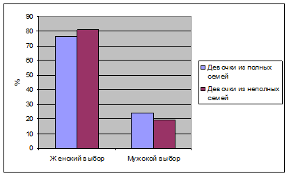 В выборах девочек обеих категорий семей присутствуют не только женские выборы, но и мужские. Заметим, что девочки из полных семей в большей мере склонны к приписыванию себе мужских качеств. Есть вероятность того, что так происходит потому, что в семье они воспитываются и матерью, и отцом. Возможно, девочки выбрали для себя некоторые отцовские качества.