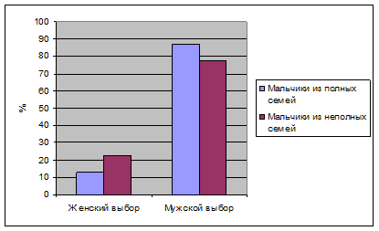 Мальчики, воспитывающиеся в полной семье, главным образом делают мужские выборы, но в их выборах присутствует и доля женских качеств, но меньше, чем у мальчиков из неполных семей.