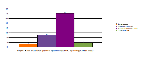 Полный и исчерпывающий ответ на второй вопрос предполагал ссылку на финансовые, научно-технические, морально-нравственные и политические трудности, существующие в природопользовании. Анализ ответов показал, что большинство опрашиваемых (71%) считают главными трудности морально-нравственного порядка, в то время как финансовые и политические трудности упомянули в своих ответах соответственно 7% и 9%.