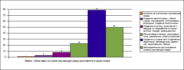 Только в 8% ответов было указано на необходимость перехода производств на малоотходную и безотходную технологию. Термины «рекультивация» и «мелиорация» упомянули в 23% анкет. О существовании служб контроля за состоянием окружающей среды указано лишь в пяти ответах(1%).