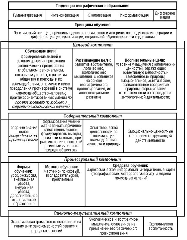 Таким образом, была сконструирована модель методики использования элементов географического прогнозирования в процессе экологической подготовки школьников при обучении географии, существенным моментом которой явилось единство целевого, содержательного, процессуального и оценочно-результативного компонентов.