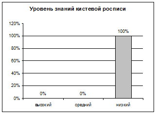 По результатам анкеты было выявлено, что у 100% учащихся класса имеют низкий уровень знаний кистевой росписи.