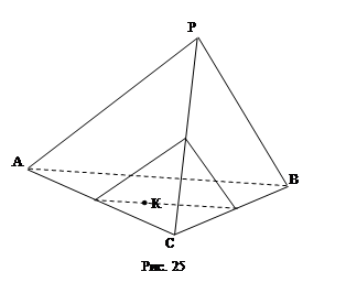 3.05. Постройте сечение треугольной пирамиды РАВС плоскостью, которая проходит через внутреннюю точку К основания АВС и параллельна грани РАВ (рис.25).