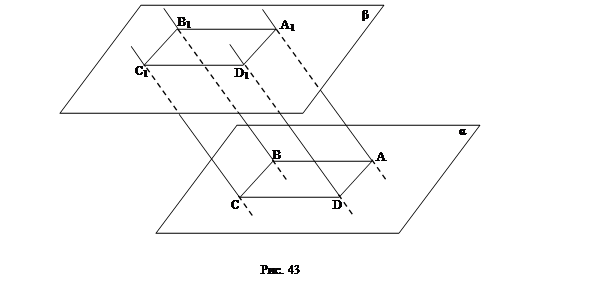 1. Через вершины параллелограмма ABCD, лежащего в одной из двух параллельных плоскостей, проведены параллельные прямые, пересекающие вторую плоскость в точках А1, В1, С1 и D1. Докажите, что четырехугольник А1В1С1D1 тоже параллелограмм (рис. 43).