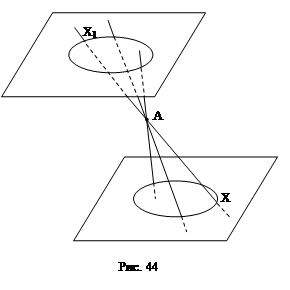 3. Даны две параллельные плоскости, точка вне этих плоскостей и окружность в одной из этих плоскостей (рис. 44). Через каждую точку Х окружности и данную точку проводится прямая, пересекающая вторую плоскость в некоторой точке Х1. Что представляет собой геометрическое место точек Х1?