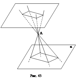 1. Докажите, что если четыре прямые, проходящие через точку А, пересекает плоскость α в вершинах параллелограмма, то они пересекают любую плоскость, параллельную α и не проходящую через А, тоже в вершинах параллелограмма (рис. 45).