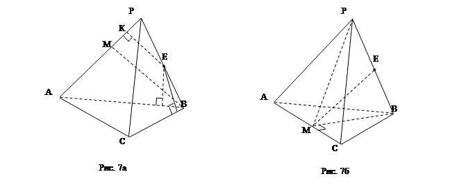 Пример 6: Точка Е – середина ребра РВ правильного тетраэдра РАВС. Опустите перпендикуляры из точки Е на прямые а) АР, ВС и АВ (рис. 7а); б) АС (рис. 7б).