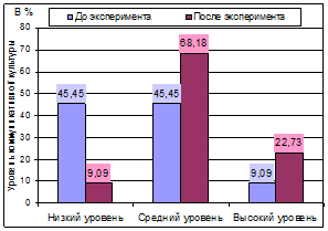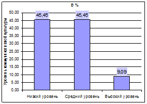 Высокий уровень сформированности коммуникативной культуры обнаружился всего у 2 человек. Эти школьники активно стремятся к организаторской и коммуникативной деятельности, испытывают в ней потребность. Быстро ориентируются в ситуациях, непринужденно ведут себя в новом коллективе. В важном деле или создавшейся сложной ситуации предпочитают принимать самостоятельное решение, отстаивают свое мнение и добиваются, чтобы оно было принято товарищами. Могут внести оживление в незнакомую компанию, любят организовывать различные игры, мероприятия, настойчивы в деятельности, которая их привлекает. Сами ищут такие дела, которые удовлетворяли бы их потребности в коммуникативной и организаторской деятельности.