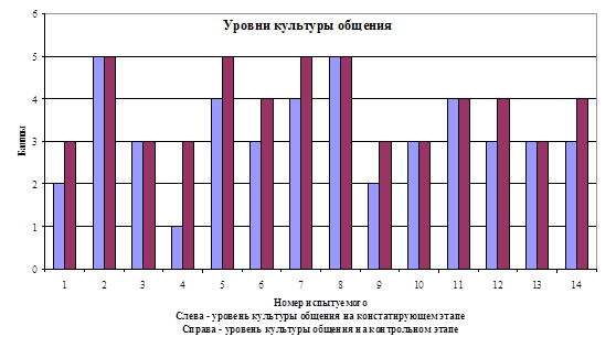 Сводная таблица уровней культуры общения в экспериментальной группе, полученные на констатирующем и контрольном этапах эксперимента
