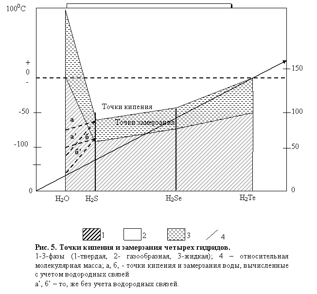 При давлении 1 атм аномальны точки замерзания (плавления) и кипения воды (соответственно 0 и 100°С). Если взять ряд соединений водорода с элементами группы Via периодической системы Менделеева — Н2Те, H2Se H2S и H2O — с учетомих относительной молекулярной массы, то окажется, что точки замерзания и кипения воды не укладываются в закономерность, общую для трех других соединений, у которых чем больше относительная молекулярная масса, тем выше точки кипения и замерзания. Точка замерзания воды должна была бы находиться между минус 90 и минус 120 °С, а в действительности она приходится на ±0 °С. То же самое можно сказать о точке кипения воды, которая должна была бы быть между 75 и 100 °С (рис. 5).