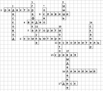 По горизонтали: 1. Программа для работы с изображениями. 4. Один из видов информации. 5 .Совокупность четко определенных правил для решения задачи за определенное число шагов. 6 .Устройство для работы с информацией. 8. Основные составляющие клавиатуры. 12. Машина или человек выполняющие алгоритмы. 13. Есть разные линии прямые и…16. Алгоритм, состоящий из последовательности операций, выполняющихся только один раз в порядке следования. 17. Носитель, предназначенный для хранения небольших объемов информации.