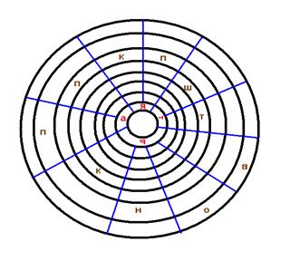 Круг разбит на секторы, каждый сектор – одно слово, которое записано по вертикали, дана первая и последняя буквы, вопросы не предложены.