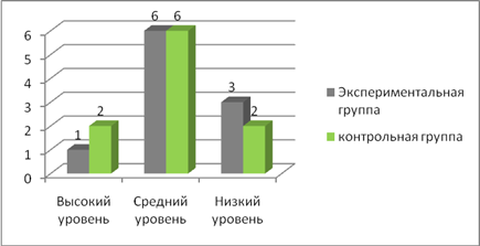 Вывод: результаты констатирующего эксперимента показали, что большинство детей в обеих группах находятся на среднем уровне представлений о форме предметов. Следует отметить, тот факт, что при примерно одинаковых результатах, средний балл результативности выполнения заданий диагностики в контрольной группе выше на 1, 7 балл, чем в экспериментальной группе. Количество детей с высоким уровнем в контрольной группе составляет 2 человека, а в экспериментальной 1 человек. На низком уровне в контрольной группе меньше на одного испытуемого, чем в экспериментальной группе.