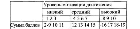 Измерить уровень мотивации достижения можно с помощью разработанной шкалы небольшого теста-опросника. Шкала эта состоит из 22 суждений, по поводу которых возможны два варианта ответов «да» или «нет». Ответы, совпадающие с ключевыми (по коду), суммируются (по 1 баллу за каждый такой ответ).