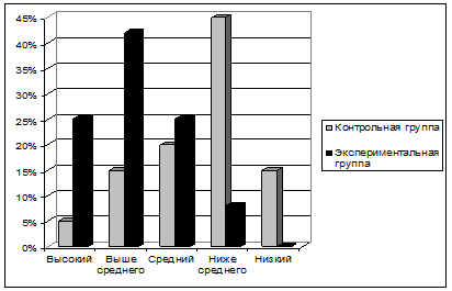 Из приведенных данных видно, что в начале эксперимента различия в уровне развития профильной направленности личности учеников обеих групп были несущественными. На момент окончания эксперимента ситуация в контрольной группе практически не изменилась, в экспериментальной же группе уровень развития профильной направленности личности школьников существенно вырос. Так, число учеников с высоким уровнем развития профильной направленности личности увеличилось на 21%; с уровнем выше среднего – на 30%; со средним уровнем – на 8%. Количество учеников с уровнем развития профильной направленности личности ниже среднего уменьшилось на 38%, низким – на 21%.