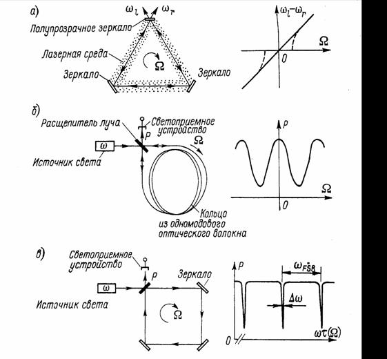 На рис. 3 приведены общие схемы систем, разработанных для повышения точности измерений. Кольцевой лазерный гироскоп (рис. 3, а) отличается высокой частотой световой волны — до нескольких сотен терагерц. Волоконно-оптический гироскоп на рис. 3, б имеет высокую чувствительность, благодаря использованию длинного одномодового оптического волокна с низкими потерями. В оптическом гироскопе пассивного типа с кольцевым резонатором (рис. 3, в) используется острая резонансная характеристика резонатора.