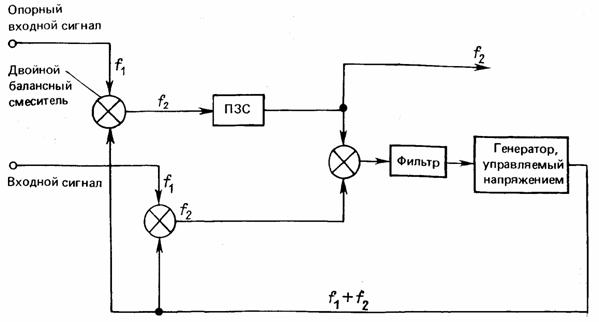 Рассмотрим только последний метод. Структура оптической системы гироскопа со световым гетеродинированием представлена на рис. 6. Световой луч разделяется с помощью дифракционной решетки на два луча с очень маленьким углом расхождения (около 10 мрад). Эти лучи, пройдя оптическое волокно в противоположных направлениях, подаются на АОМ. Угол дифракции АОМ такой же, как и у дифракционной решетки, вследствие чего АОМ здесь используется не только как частотный сдвигатель, но и как направленный ответвитель, а светоприемное устройство выдает сигнал разностной частоты. В данной оптической системе возможно разделение световых лучей, двигающихся в противоположных направлениях, но вследствие чрезвычайно малого угла дифракции эти лучи взаимодействуют и дрейф, обусловленный колебаниями среды, ослабляется. Кроме того, обычно при разности длины оптических путей возникает дрейф выходного сигнала вследствие частотного отклонения излучения источника, но в данной структуре эта разность очень мала. На рис. 7 приведена электронная схема измерителя фазы выходного сигнала в структуре на рис.6 по нулевому методу. Точная временная задержка Td обеспечивается прибором на зарядовых связях (ПЗС). Для этой схемы справедливо