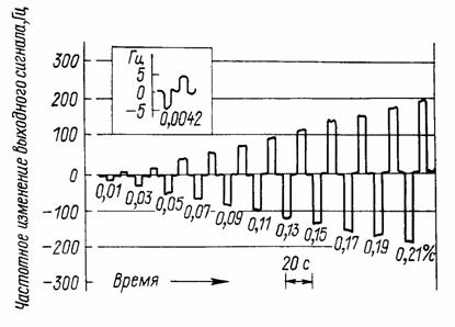 На рис. 15, а поясняется работа данной системы. По вертикальной оси откладывается изменение частоты, которое пропорционально угловой скорости, причем один отсчет соответствуег угловому сдвигу 4" (при 10-кратном усилении 0,4" на 1 отсчет). Скорость вращения земного шара 0,0042°/с, кратковременная разрешающая способность 5°/ч. На рис. 15, б приведена характеристика передачи (вход—выход). Скорость 11°/ч соответствует фазовой разности 180°. Линейность характеристики улучшена благодаря применению нулевого метода. Верхняя граница обнаружения вращения, определяемая электронной схемой, составляет 100°/c, динамический диапазон экспериментальной системы 5 порядков.