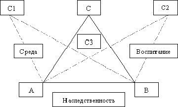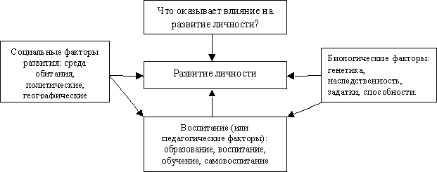Развитие детерминировано внутренними и внешними условиями. Средовые влияния и воспитание относятся к внешним факторам развития, природные же склонности и влечения, а также вся совокупность чувств и переживаний человека, которые возникают под влиянием внешних воздействий (среды и воспитания), относится к факторам внутренним. Развитие и формирование личности является результатом взаимодействия этих двух факторов. Взаимодействие факторов хорошо прослеживается в схеме чешского ученого Й.Шванцары:
