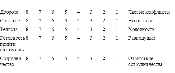 Необходимо на шкале обвести по каждому пункту, содержащему противоположные оценки, цифру – уровень, характеризующий атмосферу в семье. Если в семье царит доброта, то следует отметить цифру 8; если нечто среднее между добротой и конфликтностью, выбираем средний показатель 5 или 4; если частые конфликты, то обводим 1.