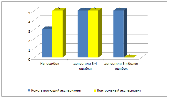 Как видно из сравнительных данных уровень обобщения детей значительно улучшился. На контрольном эксперименте без ошибок правильно разложили все картинки и подобрали обобщающие слова 50% детей. Среди детей не было выявлено, таких, которые допустили 5 и более ошибок.