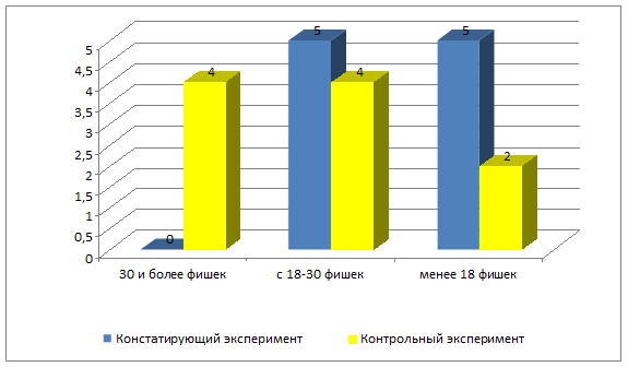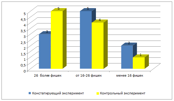 На контрольном эксперименте в группе испытуемых увеличилось детей до 5 человек, которые набрали 26 и более фишек, т.е. набрали наибольшее количество прилагательных к заданным словам.