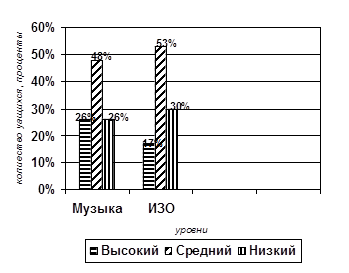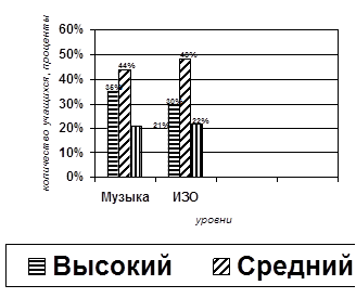 Данные результаты диагностики уровня эстетических проявлений в разных видах художественной деятельности занесены в итоговую таблицу и оформлены в диаграммы (Рис. 4, 5) (Приложение Б, таблицы 7 и 8).