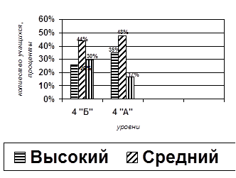 В контрольном классе (4 «А») данные показатели немного выше по указанным ранее причинам (обучение в музыкальной, художественной школах и танцевальном кружке).