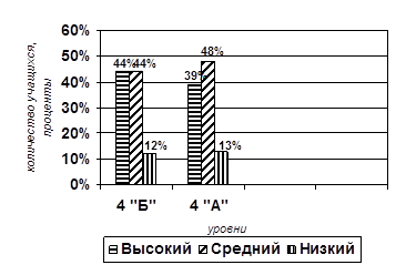 В контрольном классе (4 «А») результаты изменились совсем незначительно: 40 % детей имеют высокий уровень (на первом этапе обследования их было 35%), 48% детей имеют средний уровень (на первом этапе их было 44%), 12% детей имеют низкий уровень (на первом этапе их было 21%).