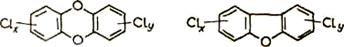Диоксины - общее название двух групп веществ - полихлордибензол-п-диоксинов (а) и полихлордибинзофуранон (б)