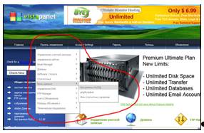 2. В основной области правой части страницы размещаются ссылки на страницы, управляющие настройками хостинга. Ссылки объединены в смысловые группы: управление ученой записью, домены, FTP Manager, управления сайтом, Email Manager, базы данных, статистика, software / услуги, управления DNS, счета обновление, техническая поддержка, помощь и обучение. Эти же ссылки компактно дублируются в раскрывающемся верхнем меню.