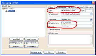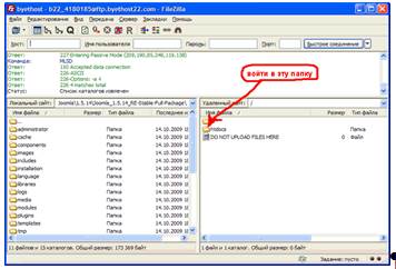 Хост, пользователь, пароль – эти данные предоставляет провайдер – они же используются и для хостинга byethost. Название хоста в левой части окна заполняется самостоятельно. Подключитесь по FTP к хостингу и закачайте распакованную файл с Joomla 1.5.14 Stable Full Russian во внутрь папки «htdocs» (рис. 6).
