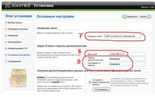Название сайта и адрес электронной почты –указать произвольно. Пароль для администратора должен содержать не менее 5 символов и более, а если в перспективе подключение форума, то не менее 6. При работе необходимо помнить, что сайт будет сразу доступен из Интернета.